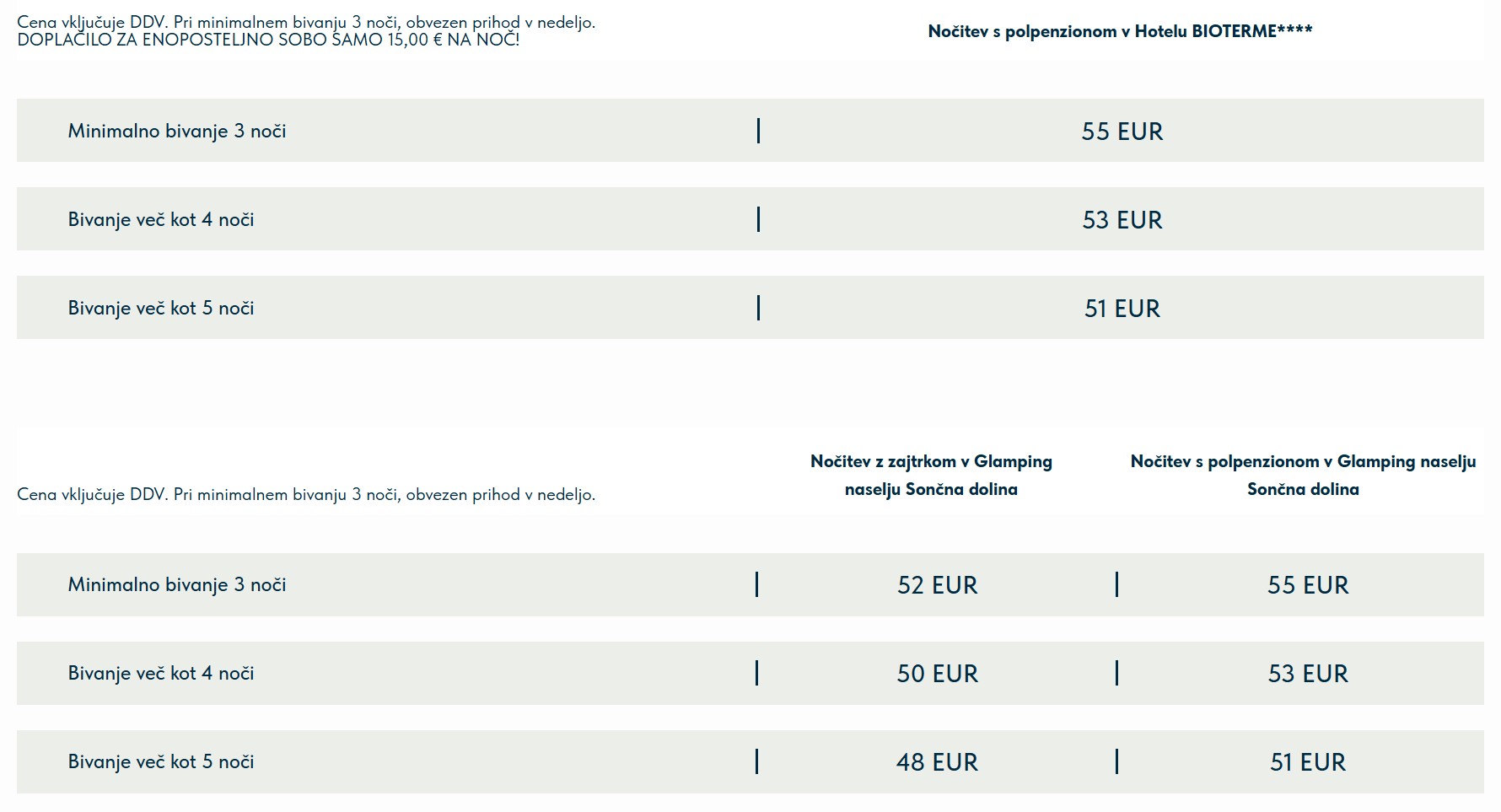 - doplačilo za enoposteljno sobo 15,00€ na noč,